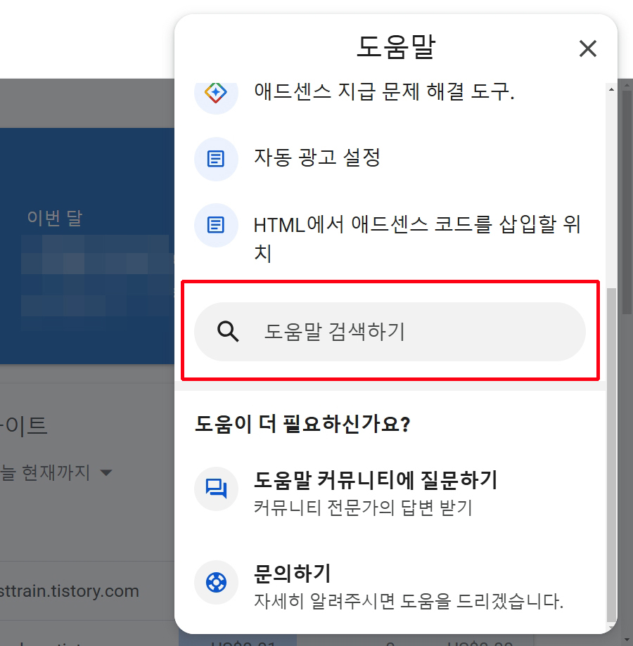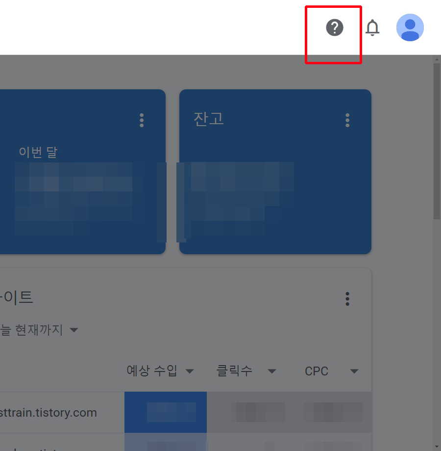 먼저 애드센스에 접속하여 상단의 물음표(도움말)를 클릭합니다.
