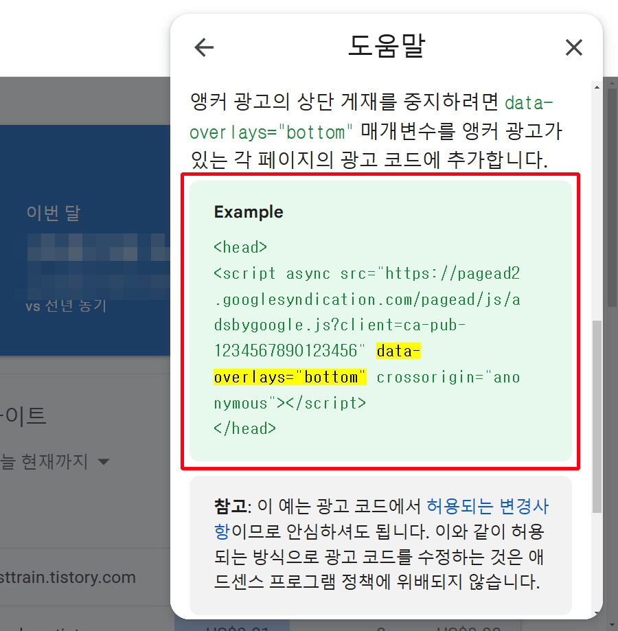<script async src="https://pagead2.googlesyndication.com/pagead/js/adsbygoogle.js?client=ca-pub-본인계정펍코드" data-overlays="bottom" crossorigin="anonymous"></script>