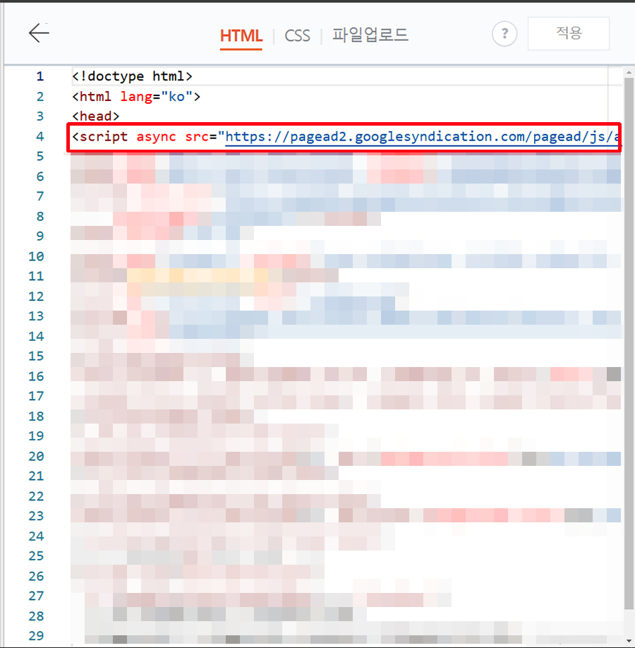 블로그의 HTML 편집에서 <head> 와 </head> 사이에 앵커 광고 하단 배치 코드를 입력합니다.