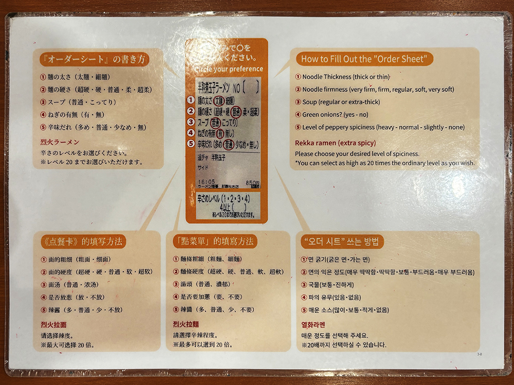 취향에 따라 면의 단단함, 매운 소스의 양을 선택할 수 있습니다. 그 밖에도 '파 빼기, 차슈 빼기' 등 요청 사항이 있으면 부담 없이 점원에게 말씀해 주십시오.