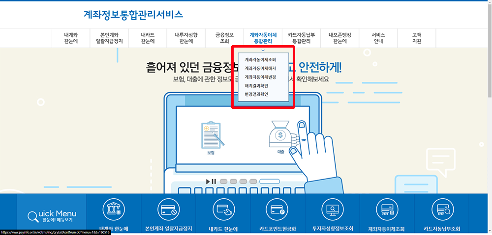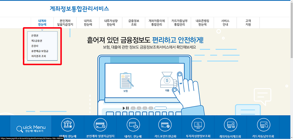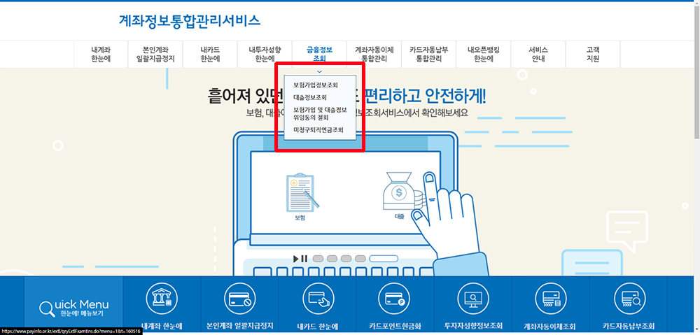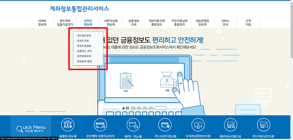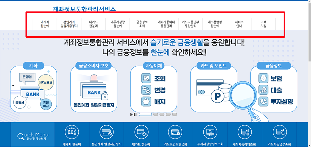 신용카드, 체크카드 등 각종 카드와 은행 등의 계좌 개설 내역 및 보험가입 내역 등을 한 번에 조회할 수 있는 서비스 계좌정보 통합 관리 서비스에 대해 알아보겠습니다.