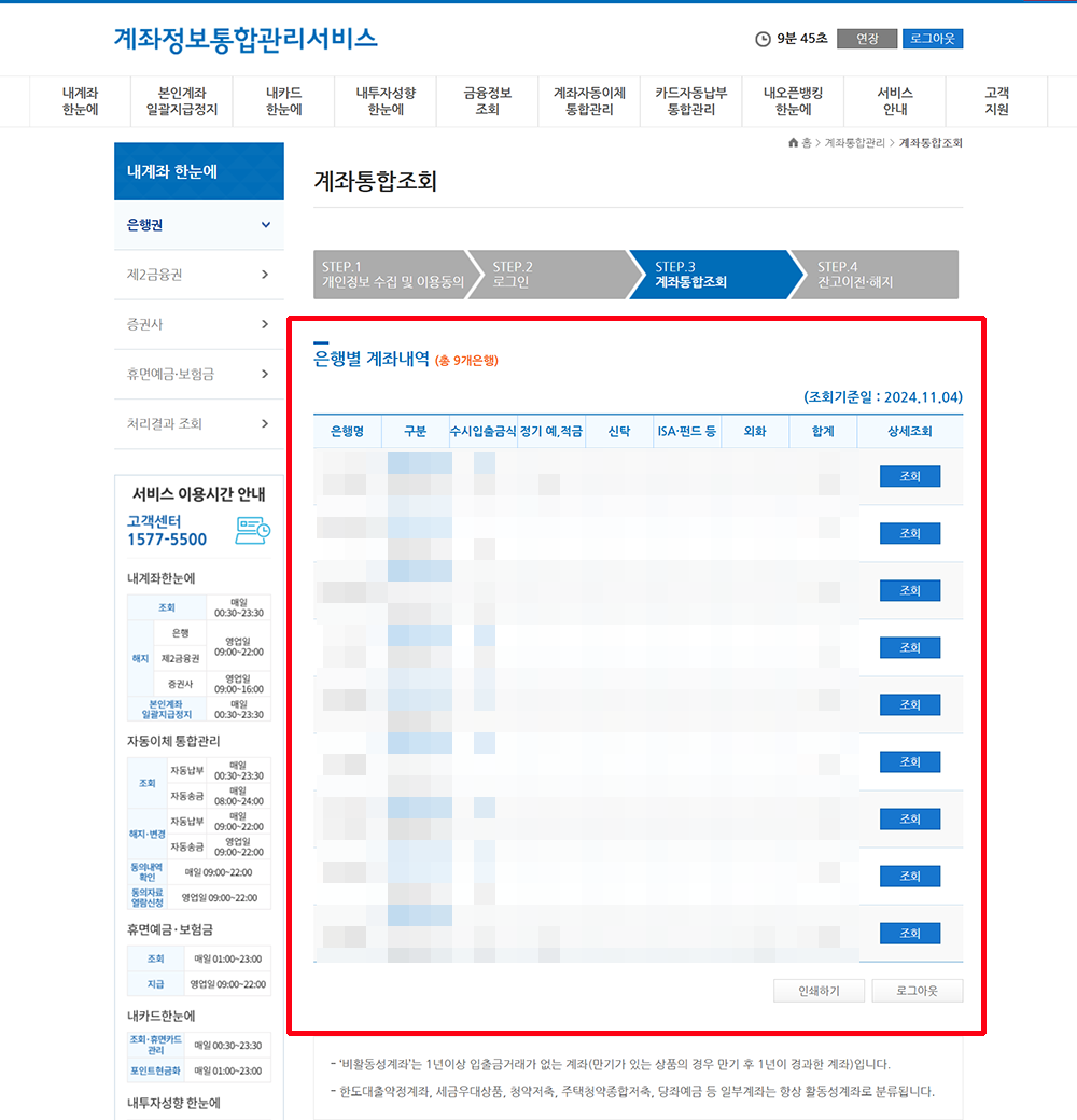 금융결제원에서 운영하는 계좌통합조회서비스는 고객 본인명의 계좌를 일괄조회하는 서비스입니다.