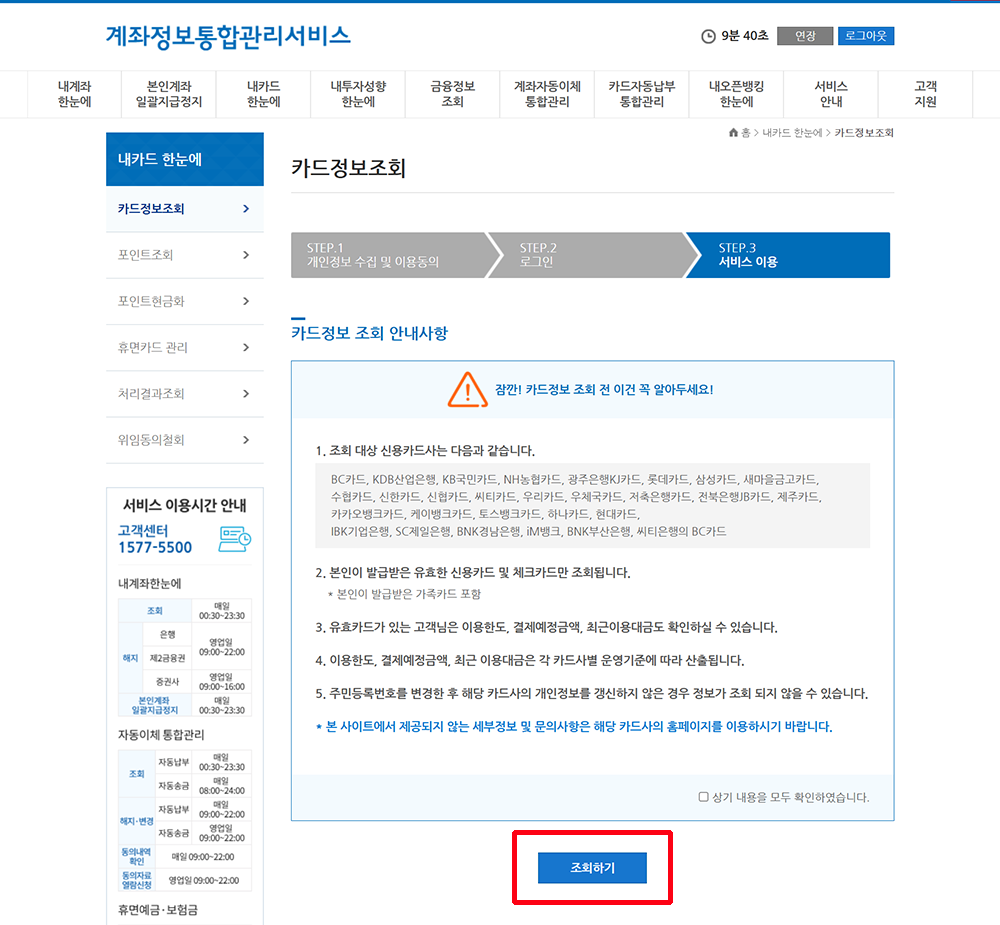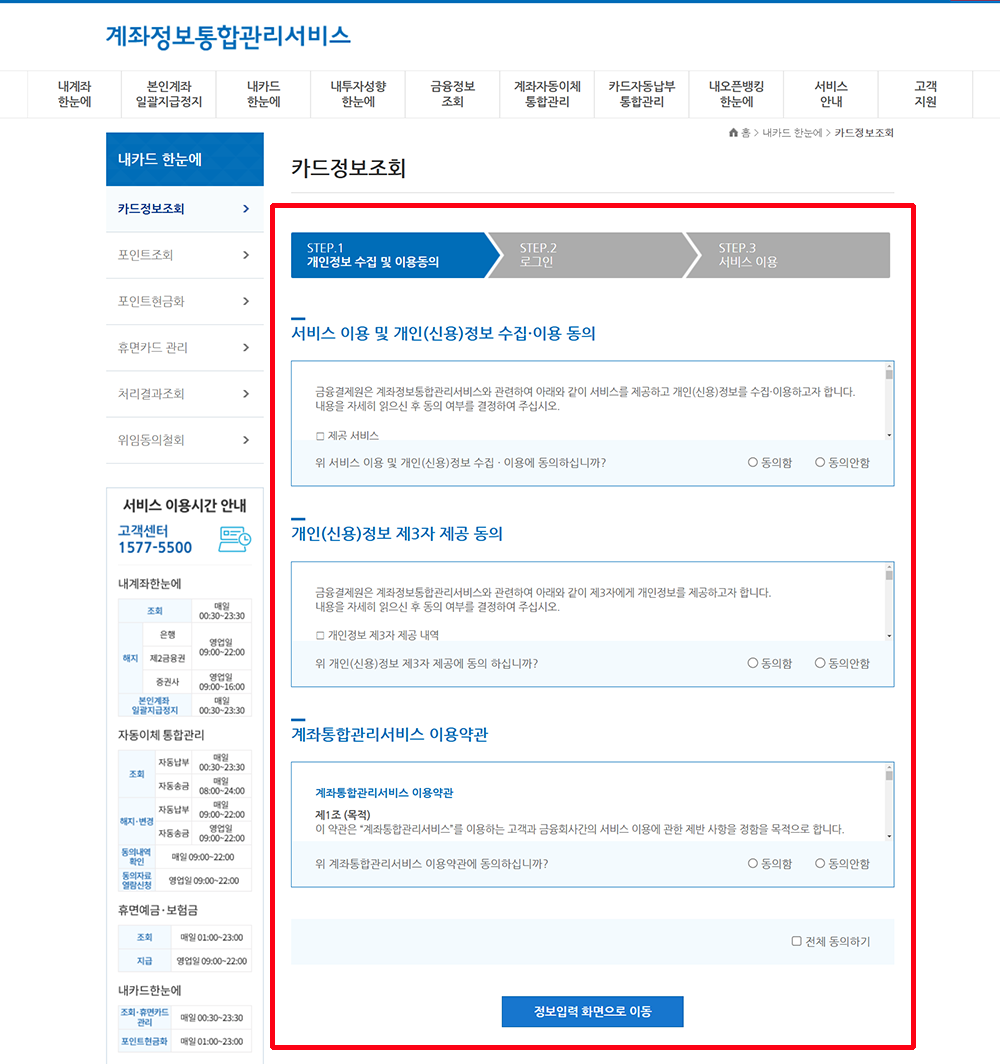 어카운트인포에 접속한 후 카드정보조회로 진입하여 개인정보수집 및 이용동의에 체크합니다.
