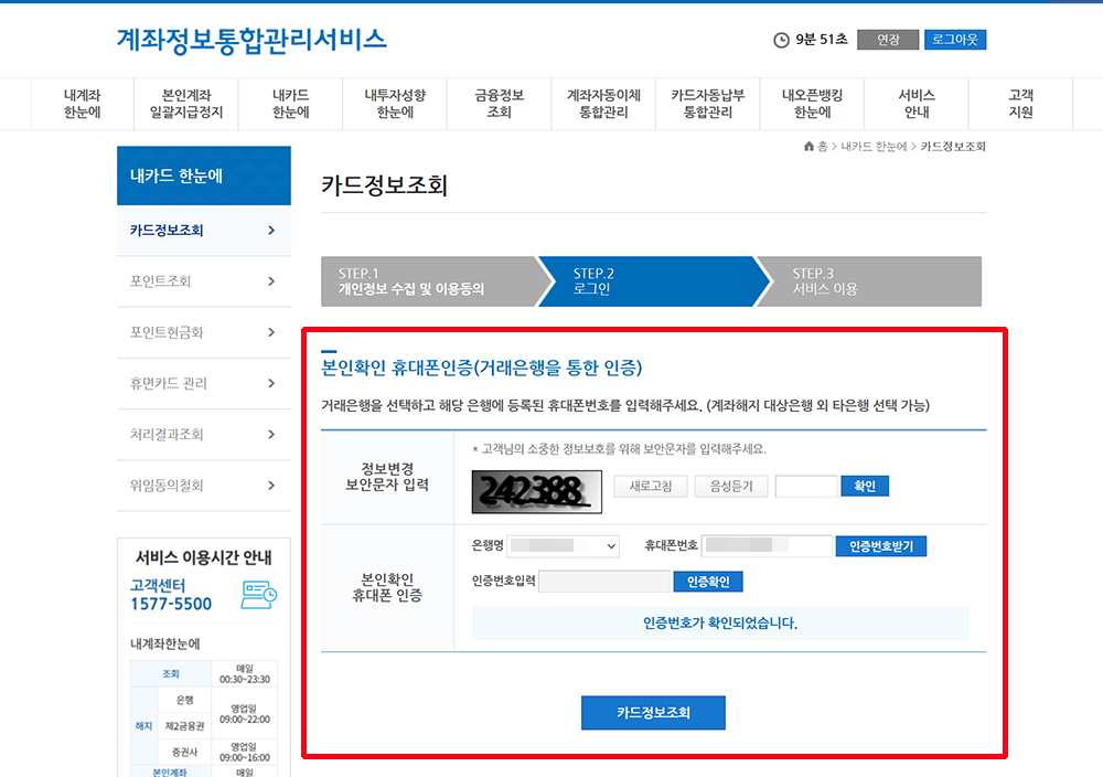 카드정보조회로 조회하는 방법의 예를 들어 보겠습니다.