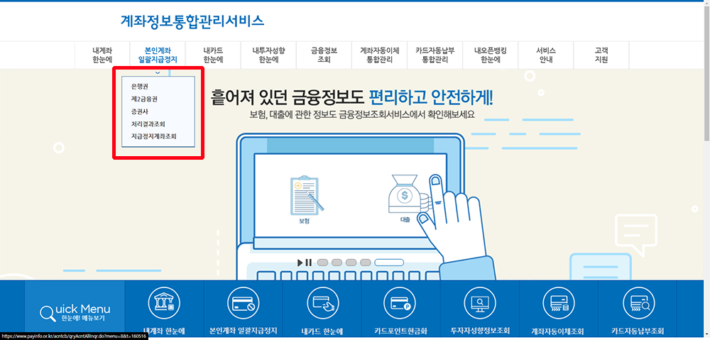 금융소비자가 계좌통합관리서비스를 통하여 금융소비자가 사기피해가 발생(우려)되는 계좌를 한번에 지급정지할 수 있는 서비스입니다.