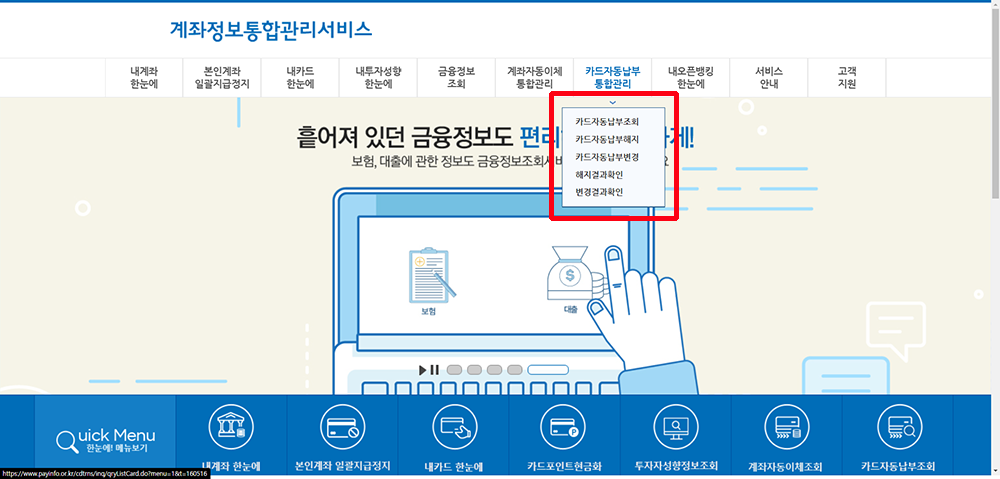 '카드자동납부 통합관리' 에서는 카드자동납부조회, 카드자동납부해지, 카드자동납부변경등을 할 수 있습니다.